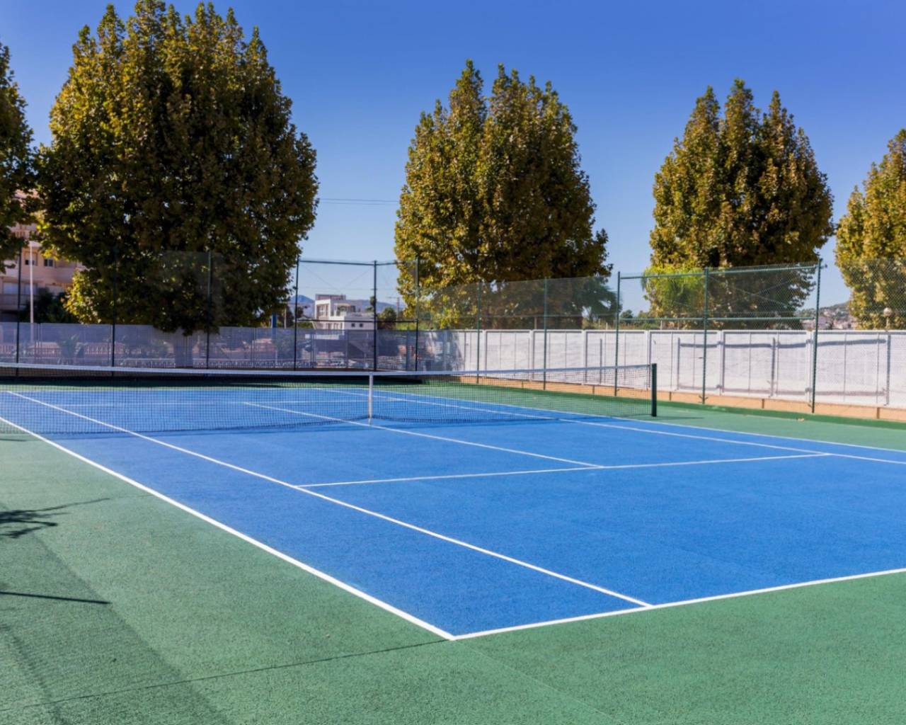 Complejo con una gran piscina comunitaria rodeada de un hermoso y bien cuidado jardín, una pista de padel, una pista de tenis, una cancha de baloncesto y una zona de fútbol.