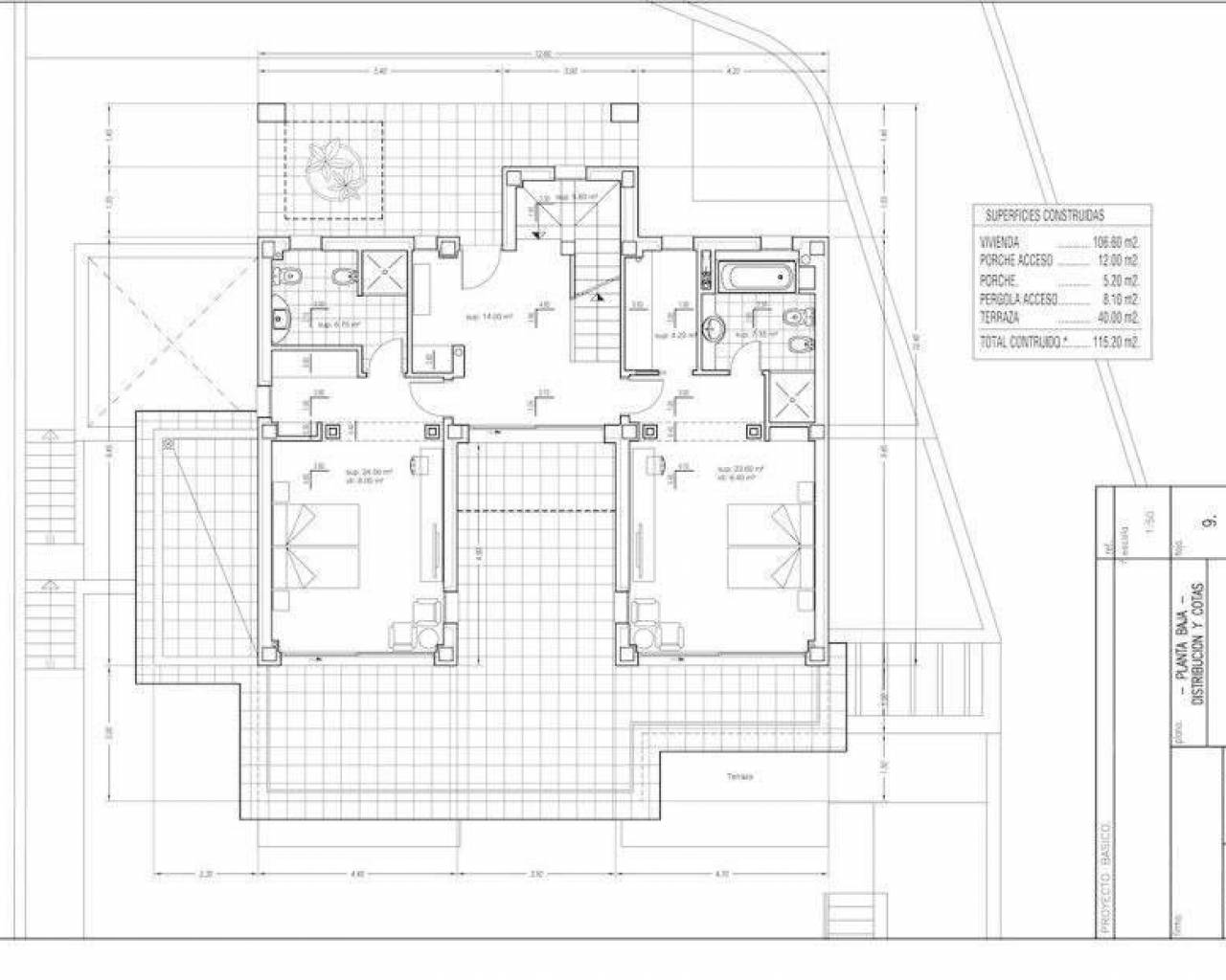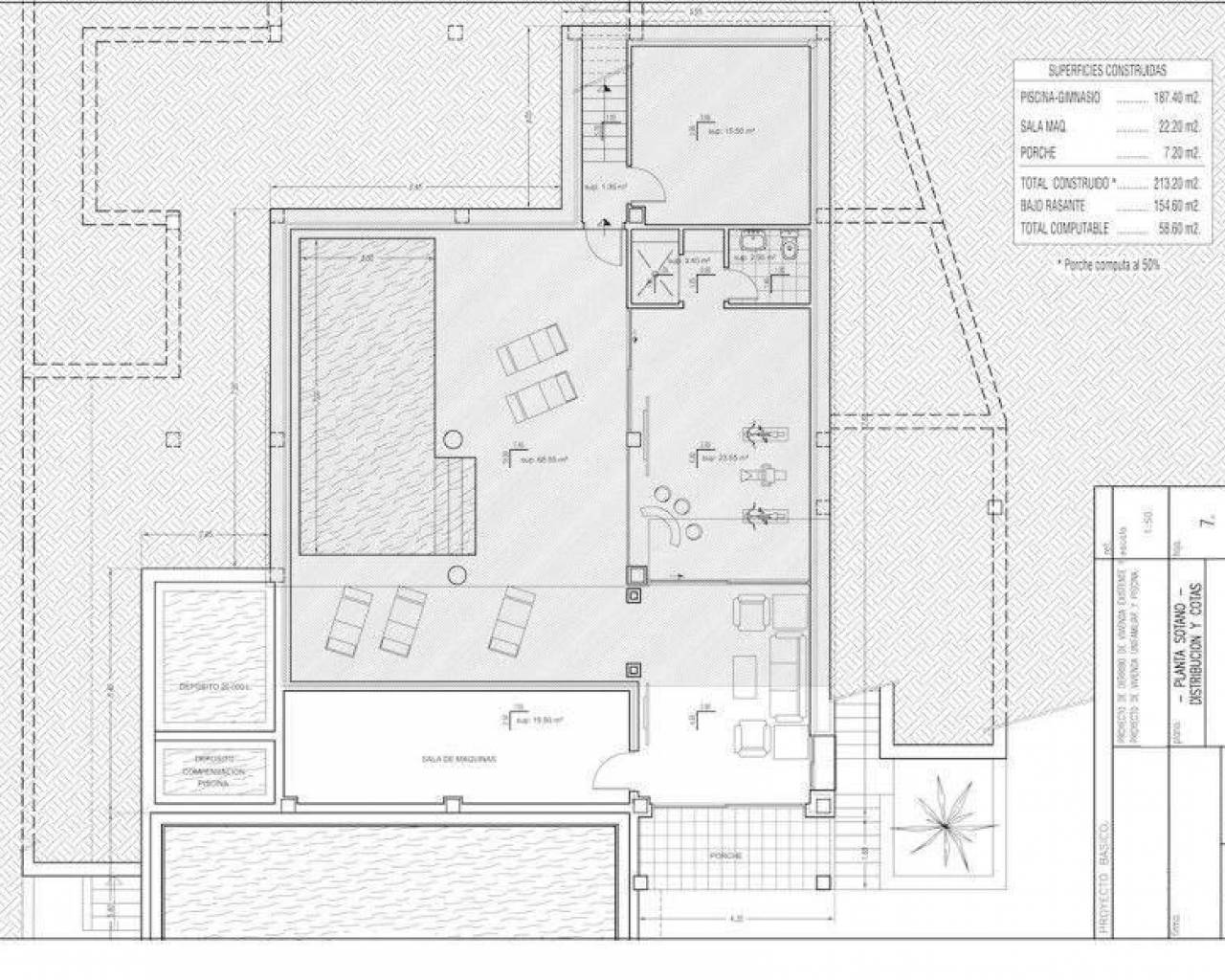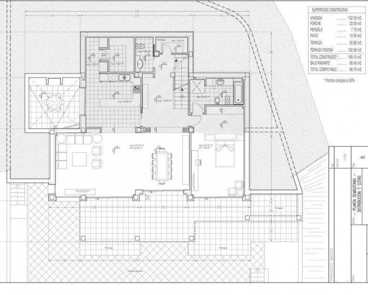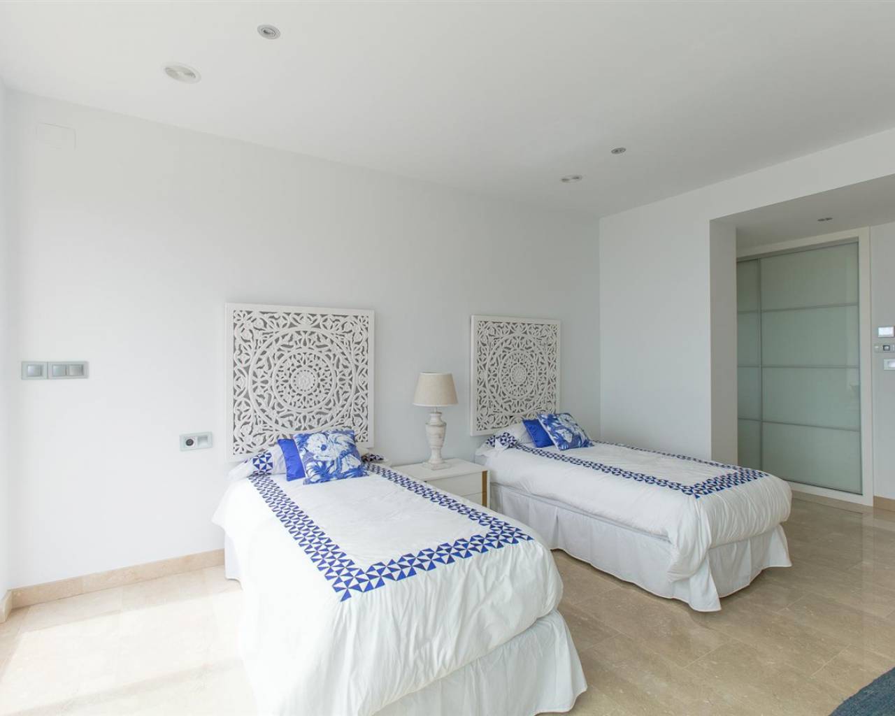 Ubicada en una parcela de 1.132m2 en pendiente, con una construccion de 559,50m2, distribuida en 3 plantas, dando estupendas vistas al mar desde cada planta. Una escalera interior une las plantas de la casa. Construido en 2014, la casa compone de 4 dormitorios, 5 banos y un aseo de cortesia y esta distribuida de la manera siguiente: Un garaje doble de 49,80m2, con dos puertas. Sotano con piscina interior de 7m x 3m, terraza interior alrededor de la piscina, gimnasio, salon de estar, cuarto de ducha y sala de maquinas. Planta principal con grande salon-comedor de 45m2, con salida al porche de 33m2 y la terraza de 123m2, con la impactante piscina, tipo infinito. Fabulosa equipada cocina con un lavadero, bodega, dormitorio doble con vestidor y su bano en suite. El jardin es de facil mantenimiento con grandes zonas de terraza, palmeras y otros arboles. La planta primera dispone de 1 dormitorio doble con vestidor y ducha en suite y 1 dormitorio con vestidor y un bano completo en suite. Ambos dormitorios tiene salida y una amplia terraza, con vistas al mar. La planta alta de 62m2, tiene el dormitorio principal, vestidor y generoso bano en suite y una terraza privada de 50m2 con fantasticas vistas al mar. Caracteristicas: Calefaccion por suelo radiante, aire acondicionado, electrodomesticos BOSCH, carpinteria AEB, puerta entrada acorazada, caldera Saunier Duval, deposito de gas, placas solares y acumulador, persianas automaticas, video-portero, per-instalacion camara, alarma, hilo musical. A solo 5 minutos al campo de golf Ifach, 3 minutos en coche al supermercado, bares y restaurantes, 5 minutos a la playa de Cala Baladrar y 6 minutos al pueblo de Moraira y sus bonitas playas.