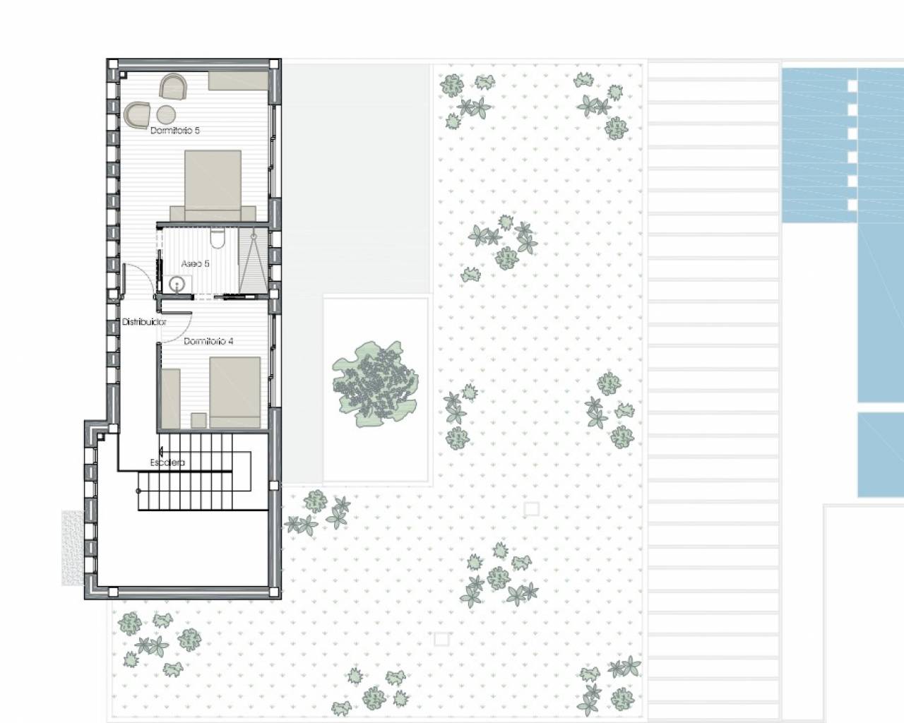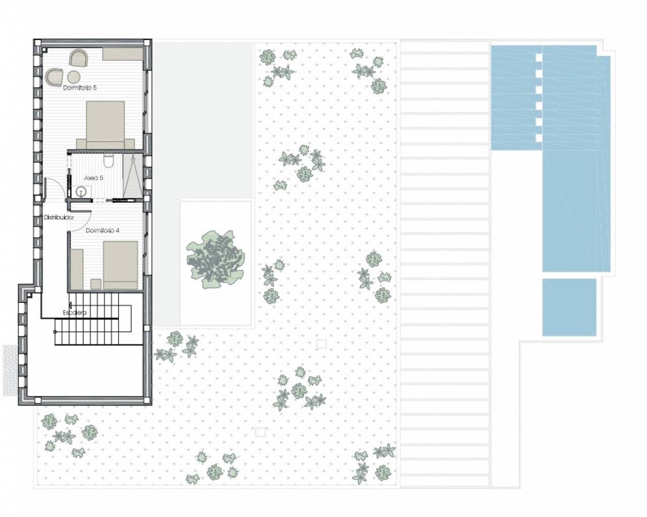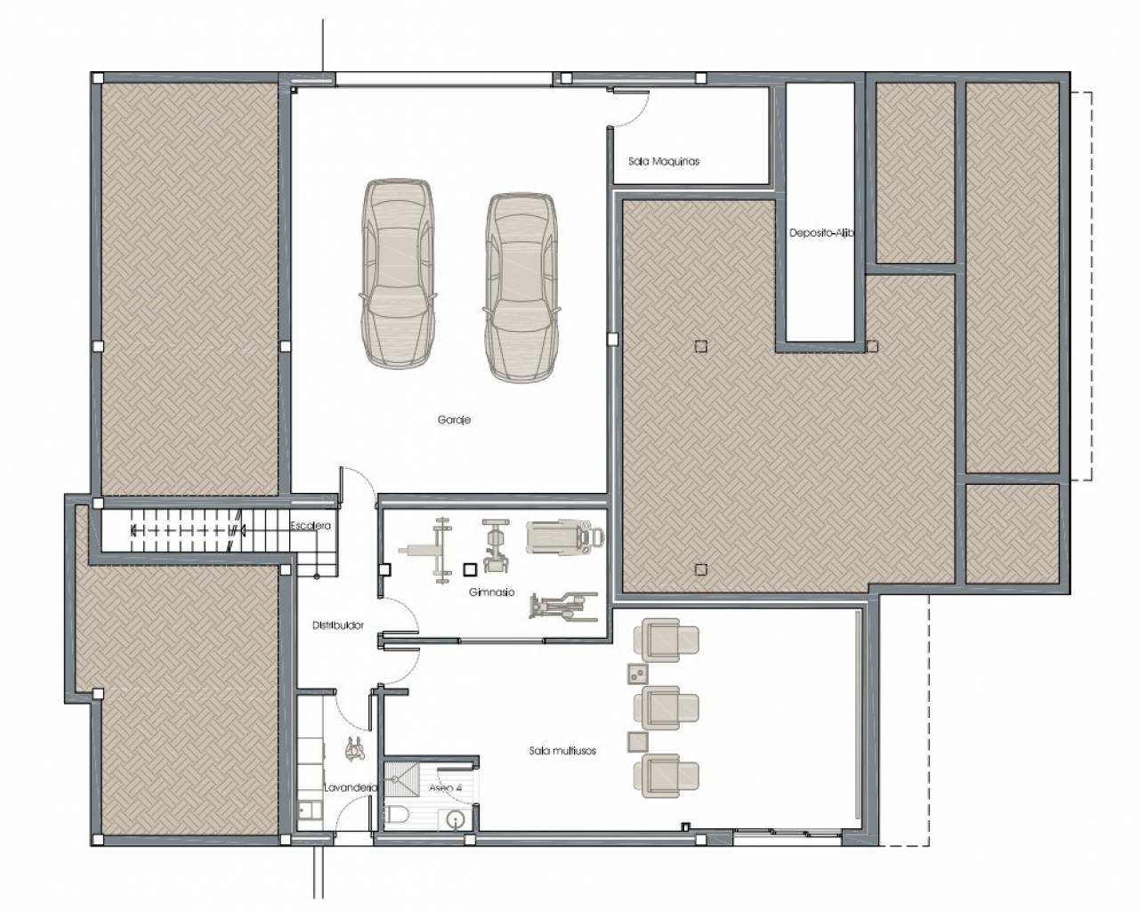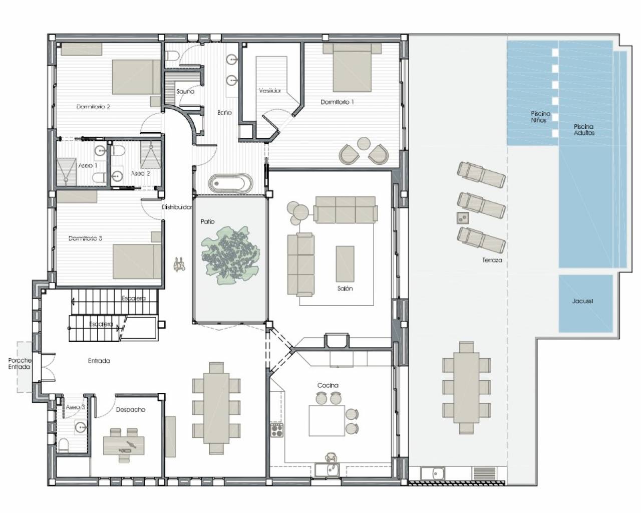 Terrain : 1 246' 46 m² Domaine : 381′ 11 m² Chambres : 5 Salles de bain : 4 Toilette : 1 Maison unifamiliale individuelle sur un terrain de 1 246,46 m² composé d'un sous-sol, d'un rez-de-chaussée et d'un étage supérieur. Le sous-sol est divisé en un garage, une salle des machines, une salle de sport, une buanderie et une salle polyvalente avec toilettes d'une superficie totale construite de 88,20 m². Le rez-de-chaussée dispose d'un patio central ouvert autour duquel s'organisent les pièces. Il est distribué dans un hall, salon, salle à manger, cuisine, bureau, toilettes invités, chambre principale avec salle de bain et dressing en suite et deux chambres doubles avec deux salles de bain en suite. Tout cela suppose une surface construite de 244,74 m². L'étage supérieur comprend deux chambres et une salle de bain, d'une superficie construite de 48'17m². La maison dispose d'une piscine à débordement, d'un bassin pour enfants et d'un jacuzzi sur son terrain. Il dispose d'un chauffage au sol et d'une pré-installation de la climatisation pour les appareils de type split.