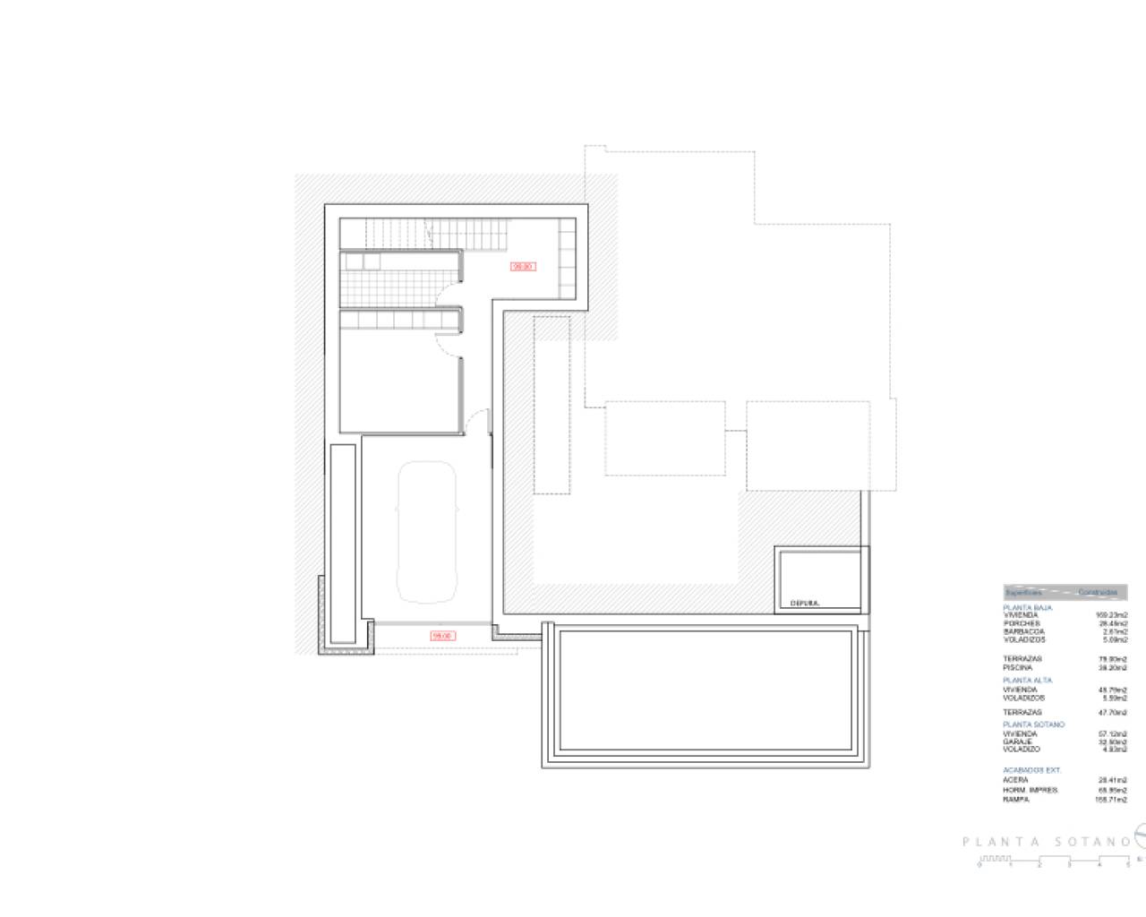 Villa moderne neuve à Benissa, San Jaime. Avec vue sur la mer, piscine à débordement, 3 étages et finitions de haute qualité. À 4 km de Moraira. Cette villa moderne neuve est à vendre dans l'urbanisation existante de San Jaime à Benissa, à seulement 4 km du centre de Moraira. La propriété est située dans un quartier résidentiel calme, à proximité des commerces, des restaurants, du terrain de golf, du port de plaisance et de la plage de sable. Grâce à son orientation sud-ouest, vous profiterez d'une vue sur la mer et d'un ensoleillement optimal. La construction de base est terminée. Description La villa est répartie sur trois étages et construite avec des matériaux de haute qualité. Au rez-de-chaussée, vous trouverez un hall spacieux, deux chambres avec salles de bains attenantes, des toilettes pour invités et un salon-salle à manger ouvert avec une cuisine entièrement équipée (Bosch ou équivalent) avec îlot central. Depuis le salon, vous avez un accès direct à la terrasse couverte qui mène à une terrasse ensoleillée avec une piscine à débordement de 5 x 8 mètres. L'étage supérieur est entièrement aménagé en suite parentale avec salle de bains privée, baignoire îlot et terrasse panoramique de 45 m². Au sous-sol, vous trouverez un garage, une buanderie et les locaux techniques. Tous les étages sont reliés par un escalier intérieur. Particularités Chauffage au solClimatisation par système de conduitsDouble vitrageAlarmeÉquipements encastrés Bosch ou équivalentsPiscine à débordement de 5 x 8 mètresDouche extérieureMatériaux de construction de haute qualitéPourquoi visiter cette villa La construction de base est terminéeSituée dans un quartier résidentiel existant et priséRue sans issue Bien située par rapport à Moraira et à la côteCette villa à vendre à Benissa combine une construction moderne et élégante avec un agencement pratique et un emplacement idéal près de Moraira. Vous êtes intéressé ? Contactez-nous et nous serons heureux de vous aider.