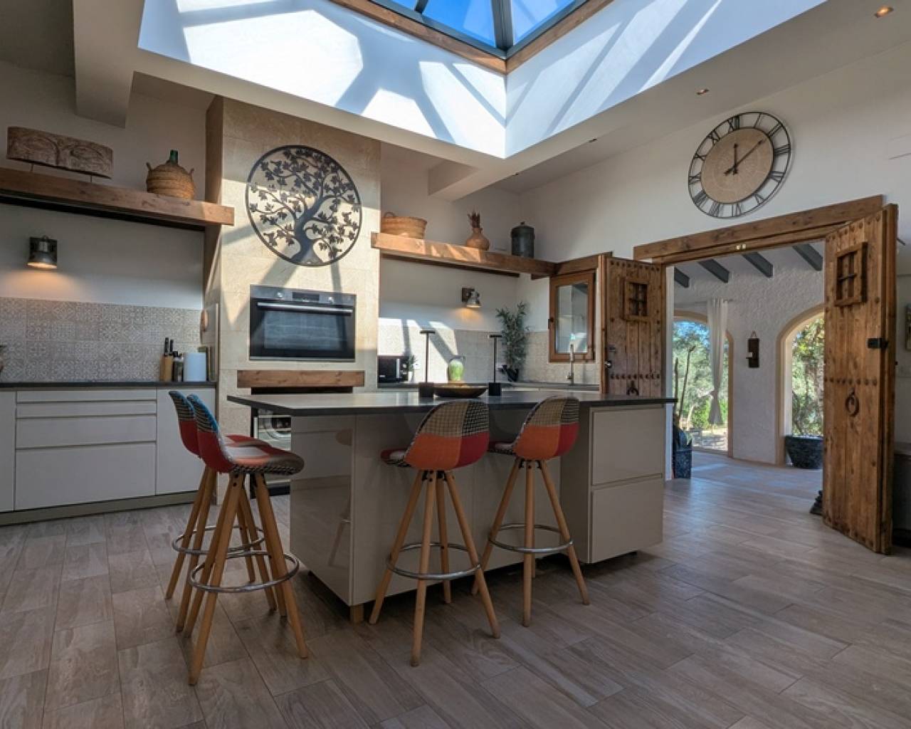 La villa principale a été magnifiquement rénovée tout en conservant son cachet. On y accède par une terrasse partiellement vitrée. Elle se compose d'une cuisine lumineuse et entièrement équipée avec un grand puits de lumière, d'un salon-salle à manger ouvert avec cheminée et accès à une terrasse donnant sur le jardin, ainsi que de deux chambres spacieuses avec salles de bains privatives.