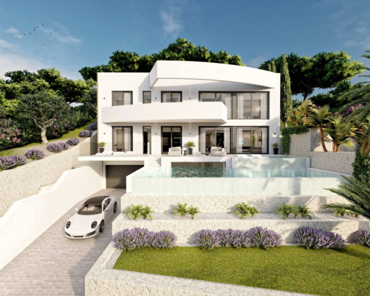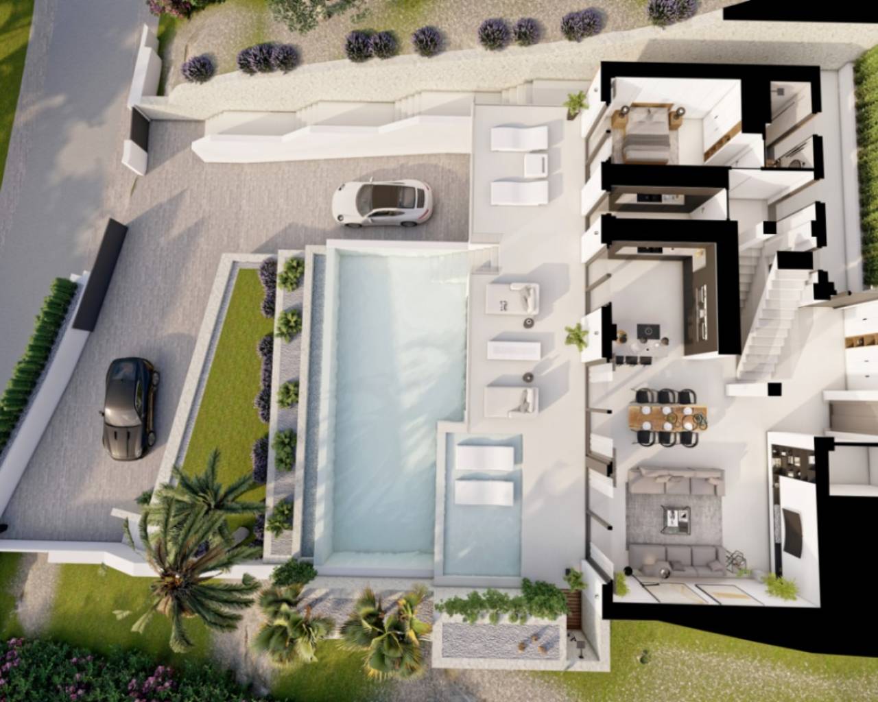 Under construction: luxurious villa in Sierra Altea By the end of 2024, Altea will have another beautiful newly built villa. This luxury property will be realised in Sierra Altea, only 650m from the nearest golf course. Quietly located yet in less than 10 car minutes from the attractive centre of Altea and the beach. On the ground floor we find a generous living-dining room with large open kitchen with working island cum breakfast bar. There is a bedroom en-suite, laundry room and guest toilet. From the kitchen, living room and bedroom you step directly onto the terrace with a large swimming pool. Part of the terrace is covered to provide the necessary coolness on hot days. In the hall is the lift that takes you to the top floor (there is also an interior staircase). There are two bedrooms en-suite with fitted wardrobes. The master bedroom is downright large with separate dressing area and bathroom with shower and independent bath. All bedrooms have access to the same terrace. Stairs continue up to the roof terrace. A fabulous space to hang out. This could really be an extra "open air" room with space for a seating area, sunbeds etc. In the underbuild is the 136 m2 garage and another room of almost 40 m2 (ideal as storage). The villa will be equipped with all comforts and will have a high level of finishing. A Mediterranean garden completes the picture. Interested in this newly built villa in Altea? Contact us for more information.