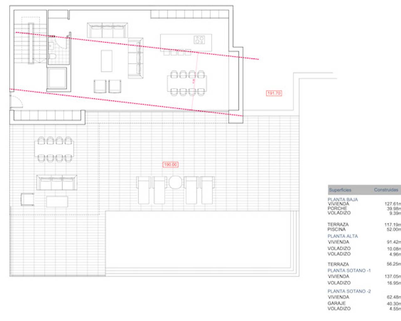 There are impressive ceiling height sliding doors that give direct access to a large terrace and the pool. The upper floor contains two bedrooms with en-suite bathrooms and a terrace.