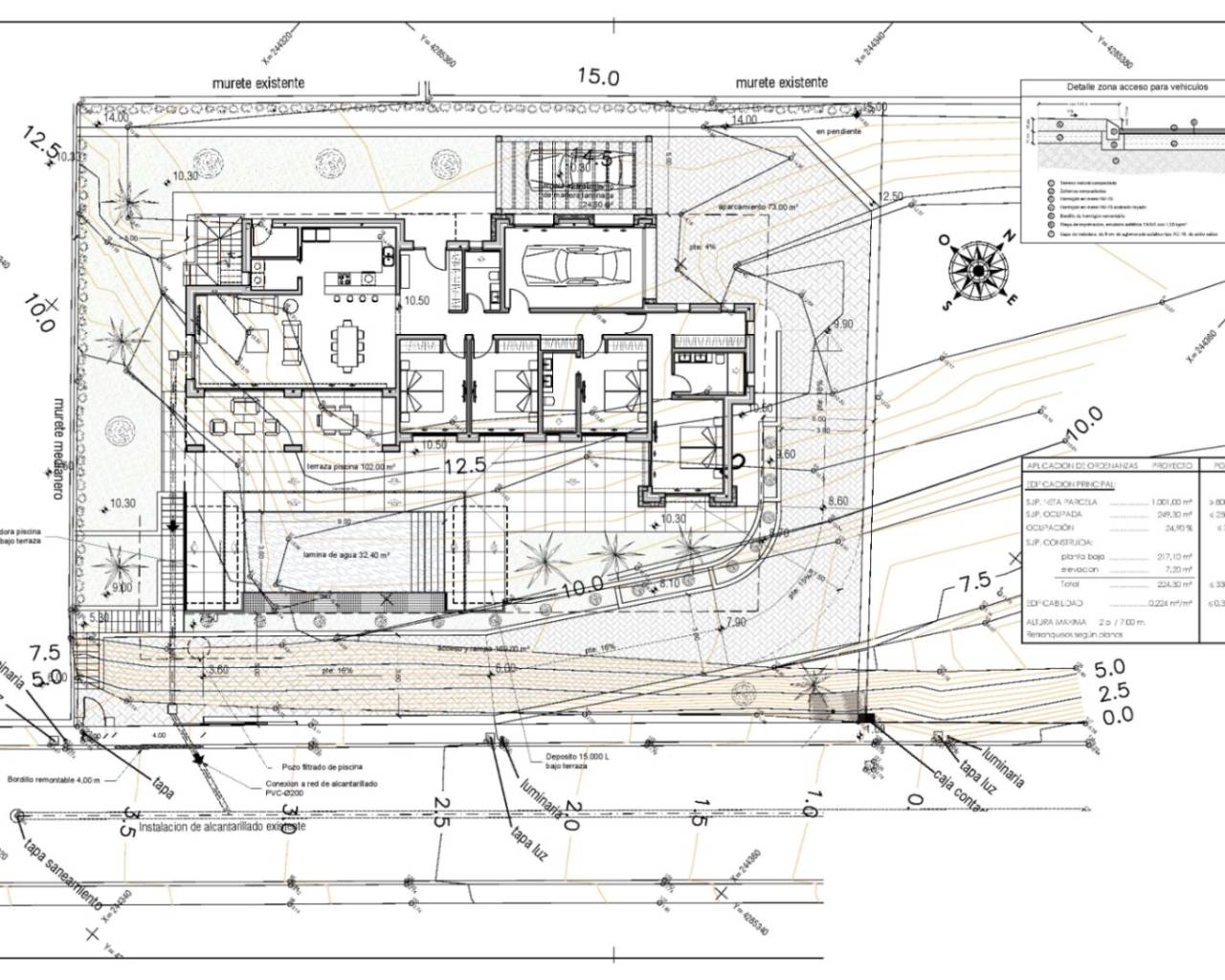Plot with a beautifully landscaped garden, a private pool and a parking area including a pergola.