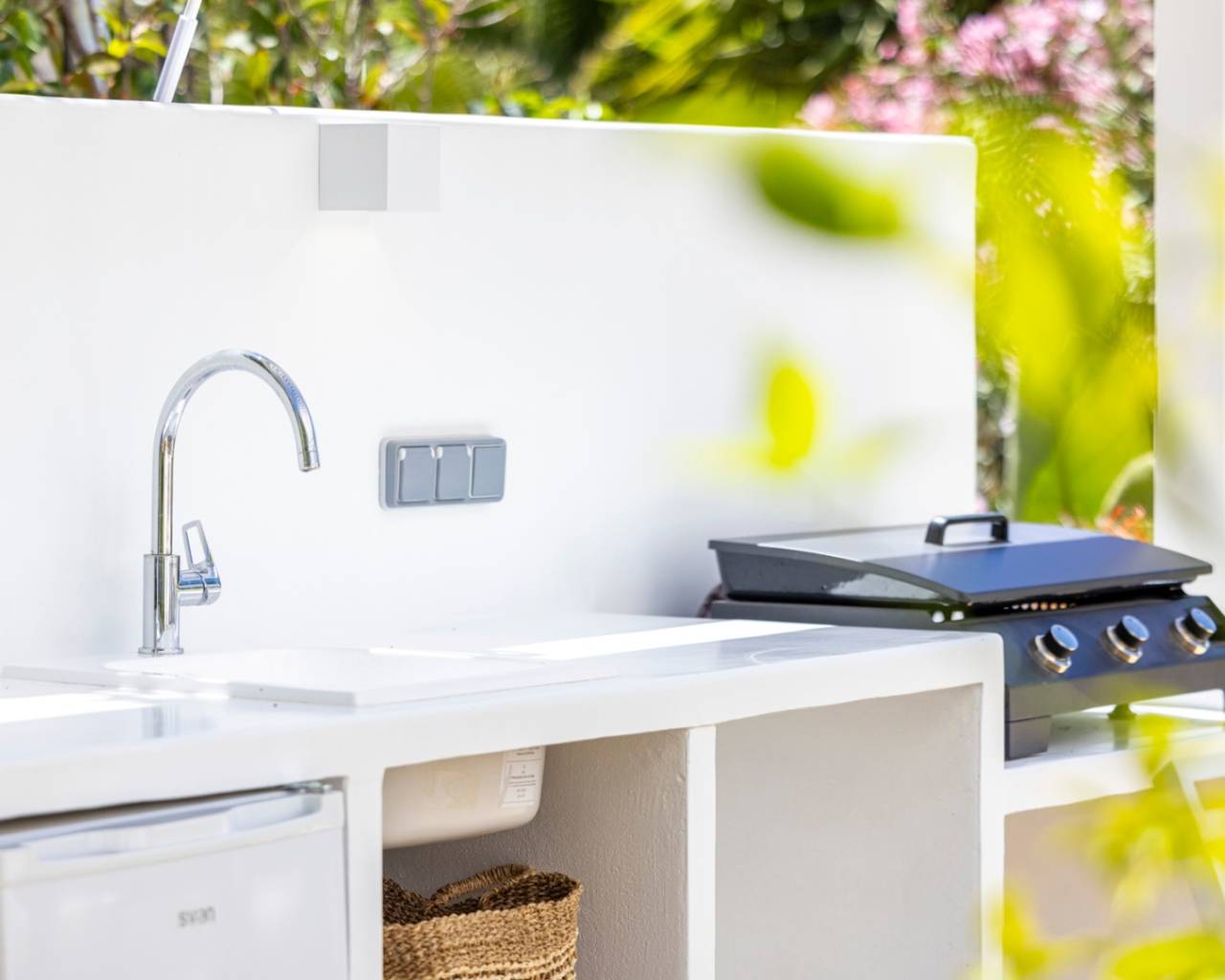 The villa offers 2 double bedrooms with air-conditioning and a twin room with a ceiling fan, 2 bathrooms (one is ensuite), spacious lounge-diner with a separate reading area and a fully equipped kitchen which connects to an outdoor summer kitchen with a fridge, grill and barbecue. The property benefits from a smart TV with international channels and reliable wi-fi,
