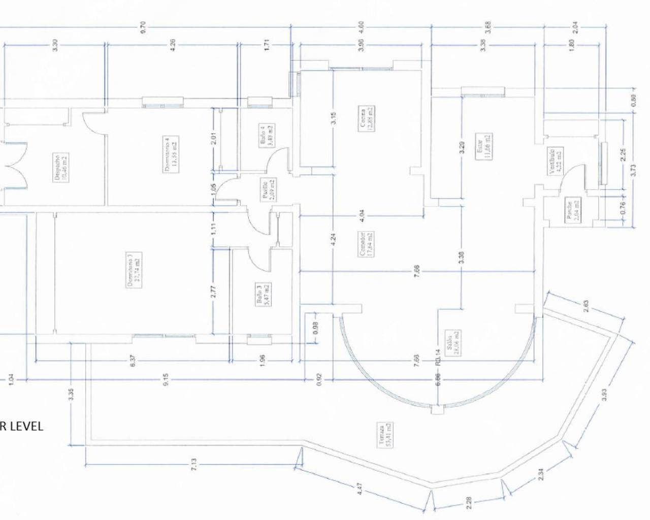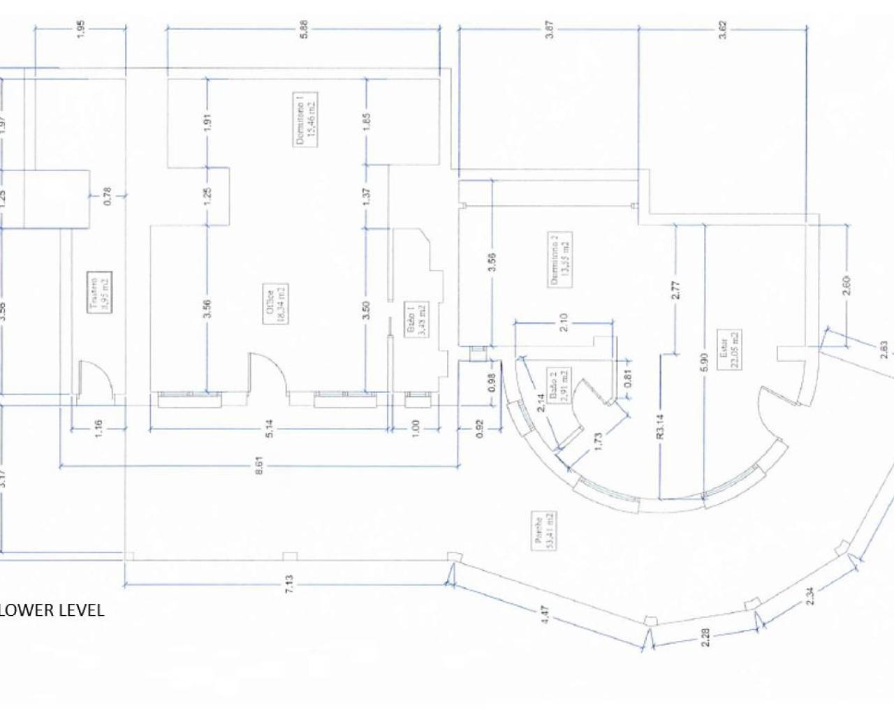 The lower floor comprises an independent guest apartment with 2 bedrooms, 2 bathrooms, an office, a living area, a storage room and a covered poolside terrace.