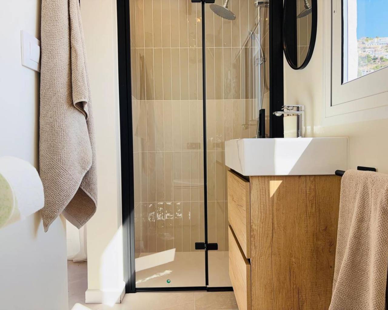 On the upper floor is the second bedroom with ensuite shower room. This level also features access to a spacious open terrace, complete with an outdoor kitchen and utility area. The terrace offers breathtaking views of the sea and the surrounding mountains.