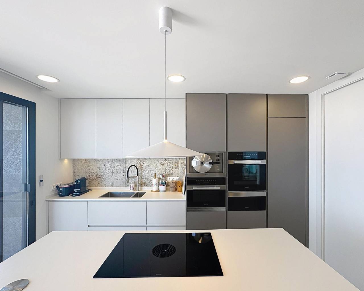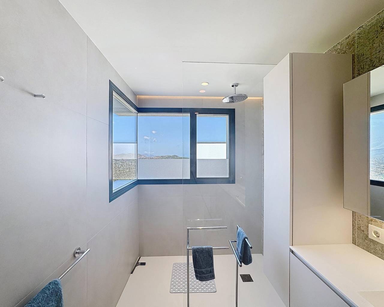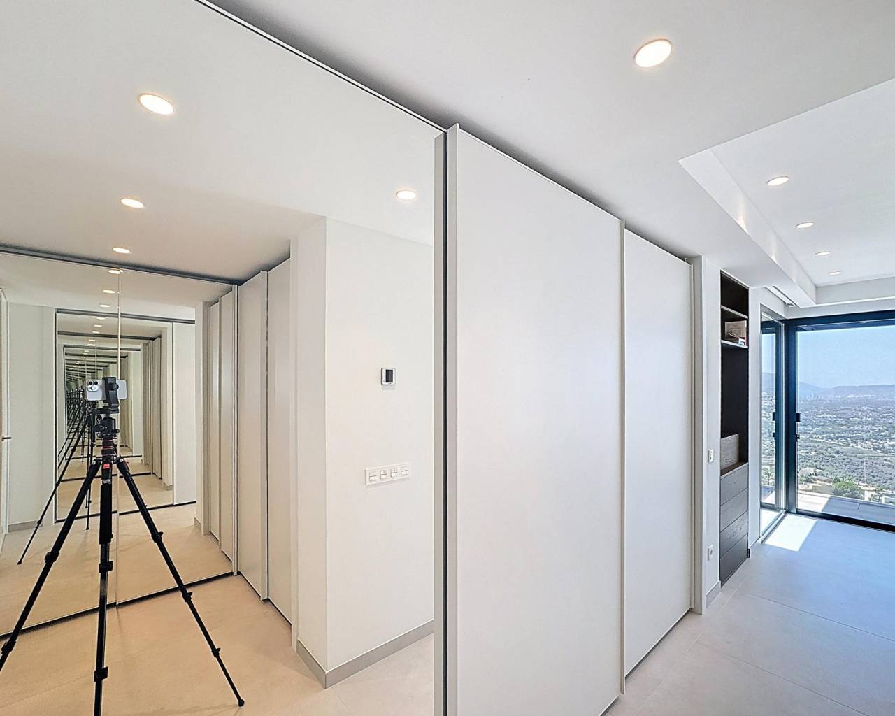 The entrance level comprises: covered garage (46m²), a utility room and the main entrance to the property. From here, there is a spectacular open-plan area overlooking the double-height lounge and a huge panoramic window with sea views. Also on this level there are 3 double bedrooms all with fitted wardrobes and ensuite bathrooms and access to terraces with views. The master bedroom has an elegant dressing room and access to a private terrace.