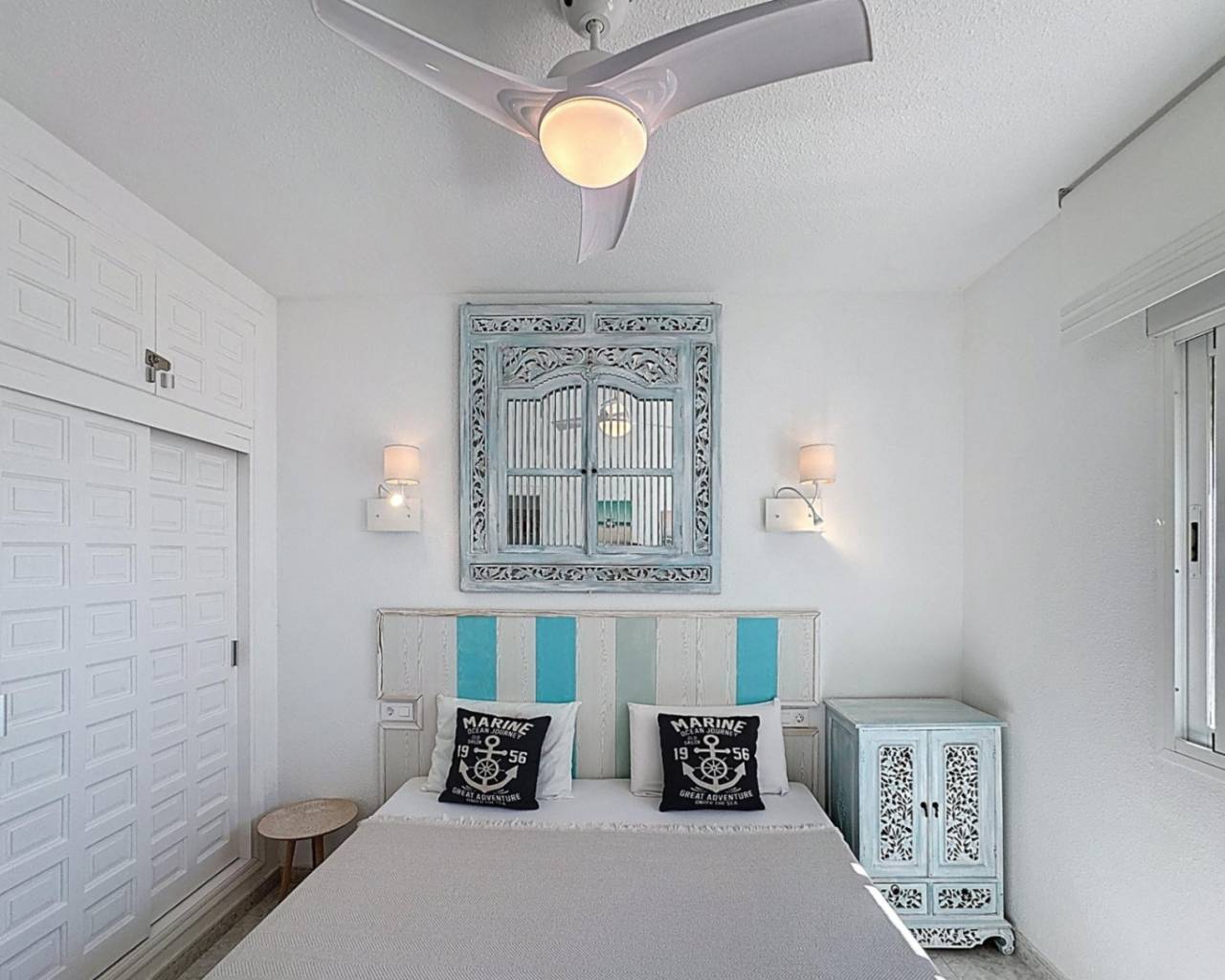 The apartment consists of: 2 double bedrooms with fitted wardrobes, a spacious renovated bathroom, fully equipped open-plan kitchen, bright lounge-diner with access to the 20m² partially covered terrace.