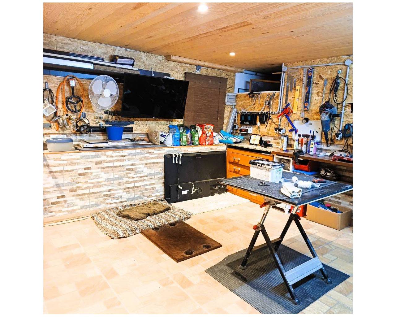 Next to the covered carport for 2 cars, on the lower floor, there is a workshop and a large space ideal for storage or a gym.